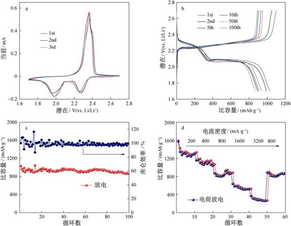 為了評估活性炭作為陰極的電化學性能,將鋰箔作為陽極組裝到鋰硫電池的紐扣電池中。用于第一,第二和第三個循環(huán)的循環(huán)伏安圖(CV)曲線上在0.05毫伏·秒的掃描速率的電位窗口進行(圖2A)。在第一循環(huán)期間,觀察到兩個陰極峰在2.26和1.97 V,CV曲線中最初的幾個循環(huán)幾乎重疊,這表明循環(huán)穩(wěn)定性極佳,容量保持率相對較高。活性炭的恒電流充電/放電曲線和循環(huán)穩(wěn)定性的測試中,如在圖中所描述2B、C。活性炭電極的首次放電容量為1045 mAh·g -1,約為硫理論容量的62.5%。此外,活性炭電極在第100次循環(huán)時也顯示出869.8mAh·g -1的放電容量。如圖2d所示測量活性炭的倍率性能,在200–3200 mA·g -1下表現(xiàn)出1260、1050、806、513、290 mAh·g -1的可逆放電容量。此外,當電流密度達到800 mA·g時,活性炭陰極的放電容量為802 mAh·g -1。多孔活性炭材料表現(xiàn)出中等的鋰硫電池電化學性能,顯示出高性能鋰硫電池的潛力。