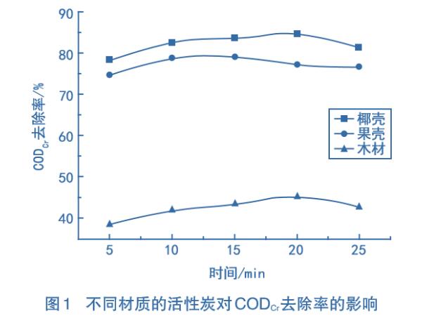 在染料廢水中,分別加入相同目數、相同質量的椰殼類、果殼類和木材類顆粒活性炭,在常溫條件下,測定不同吸附時間時的CODcr去除率,結果如圖1所示。