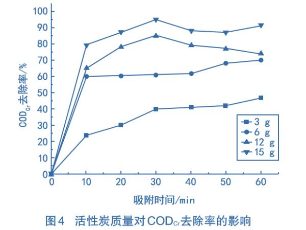 在染料廢水中,分別加入不同質量的顆粒狀活性炭,在常溫條件下吸附,測定不同吸附時間的CODcr去除率,結果如圖4所示。