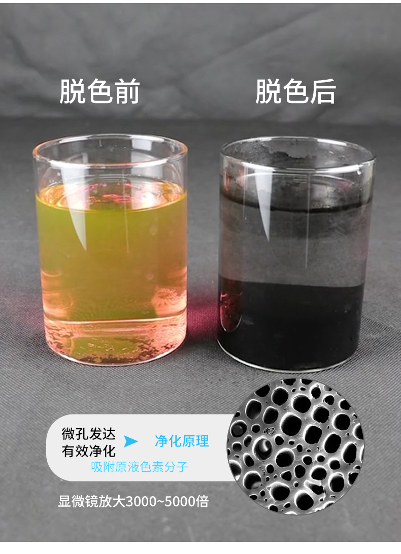 該產品由木屑制成,并通過獨特的磷酸生產工藝進行精制。它具有較大的比表面積,吸附能力強,性能穩定。主要用于糖,油,食品添加劑,化學添加劑,燃料中間體和藥物制劑等高顏料溶液的脫色,凈化,除臭和雜質去除。